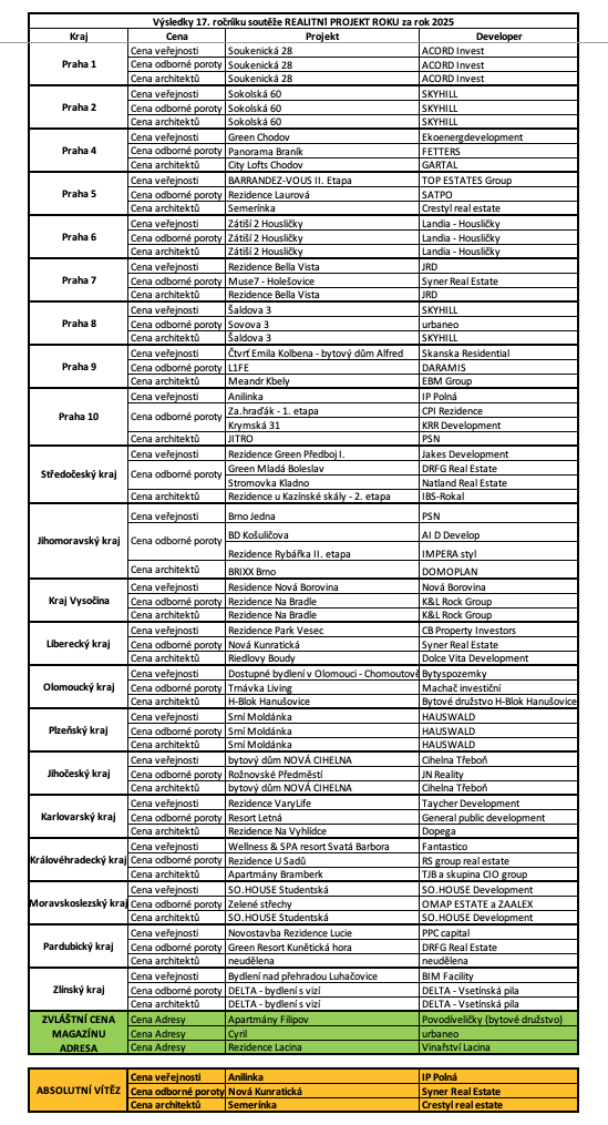 Výsledky byly slavnostně vyhlášeny během galavečera při příležitosti předávání ocenění těm nejlepším rezidenčním projektům v České republice.