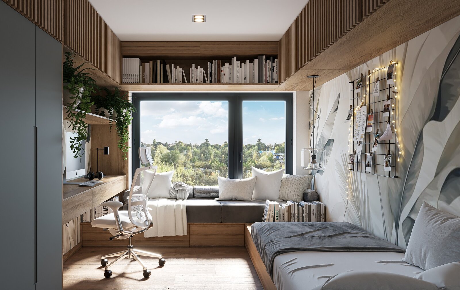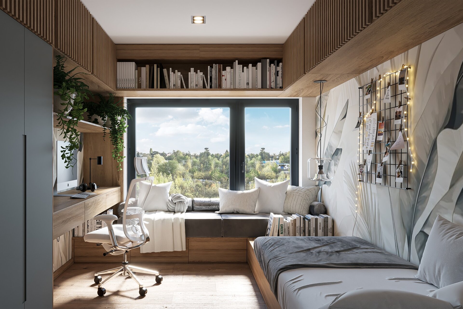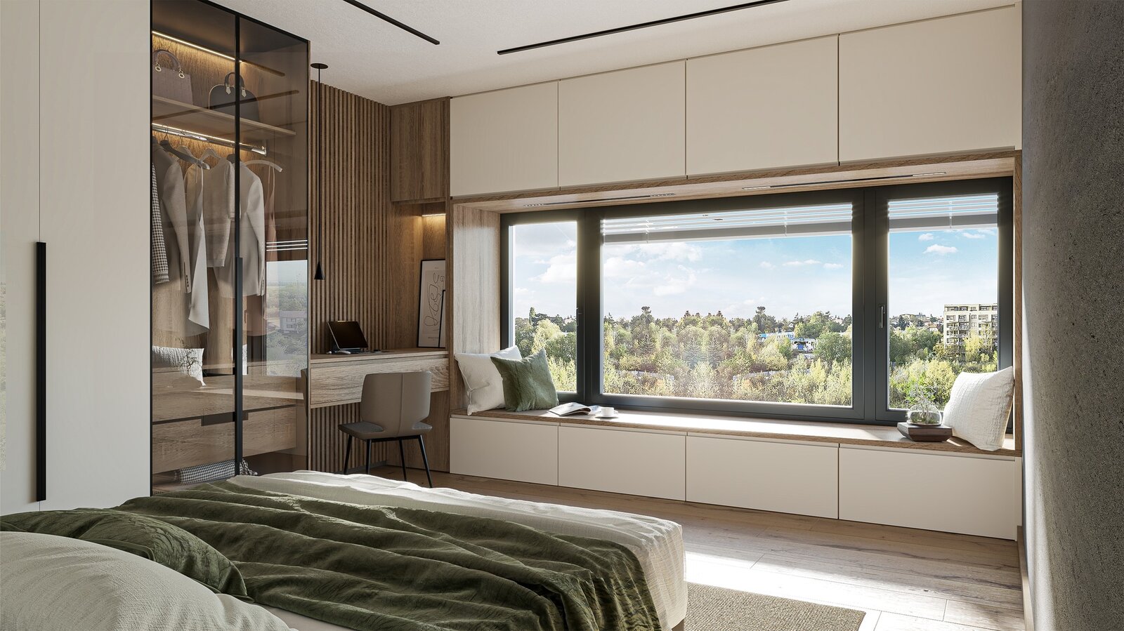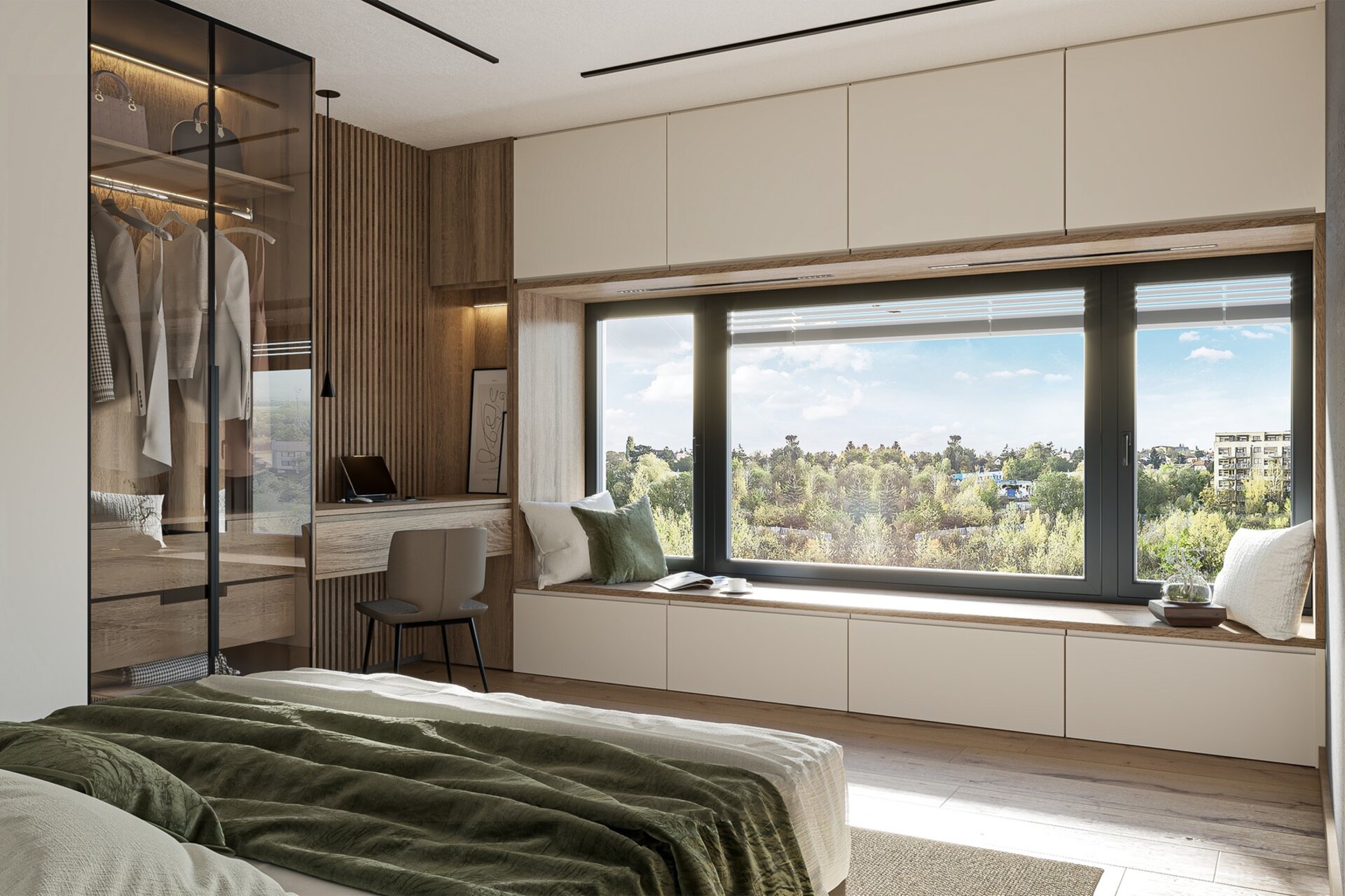 Výjimečným benefitem jsou velkoformátová hliníková okna se sníženými rozšířenými parapety, která vytváří útulný koutek pro pozorování okolí, čtení, hraní nebo relaxaci a stávají se oblíbeným místem celé rodiny.