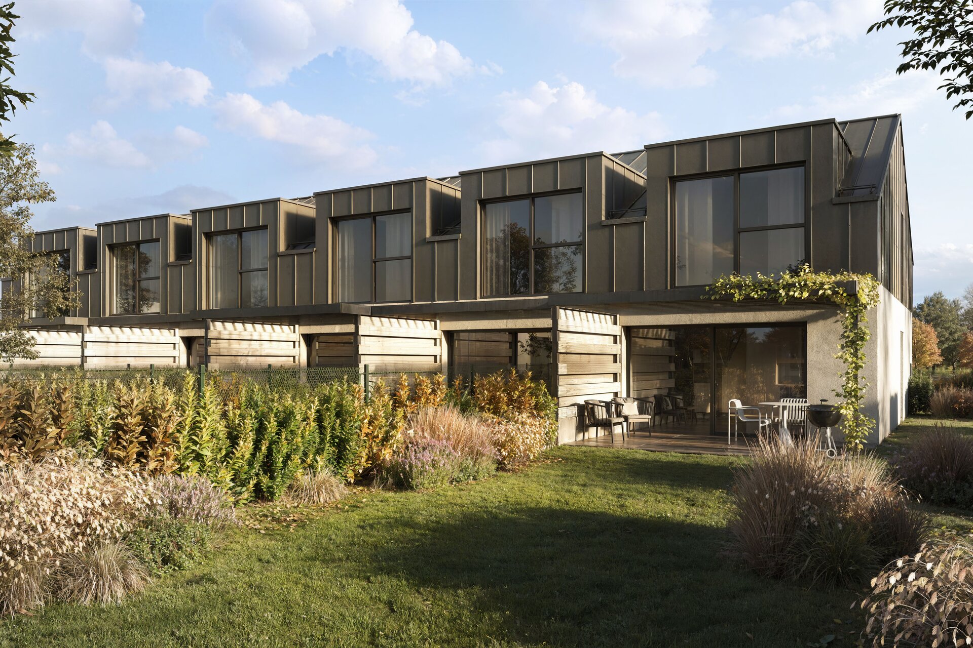 Každý dům má také svou vlastní zahradu, která poskytuje ideální prostor pro relaxaci, rodinné chvíle nebo volnočasové aktivity na čerstvém vzduchu. Pro rodiny s dětmi se navíc v těsné blízkosti nachází dětské hřiště, které nabízí bezpečné a zábavné prostředí pro nejmenší.