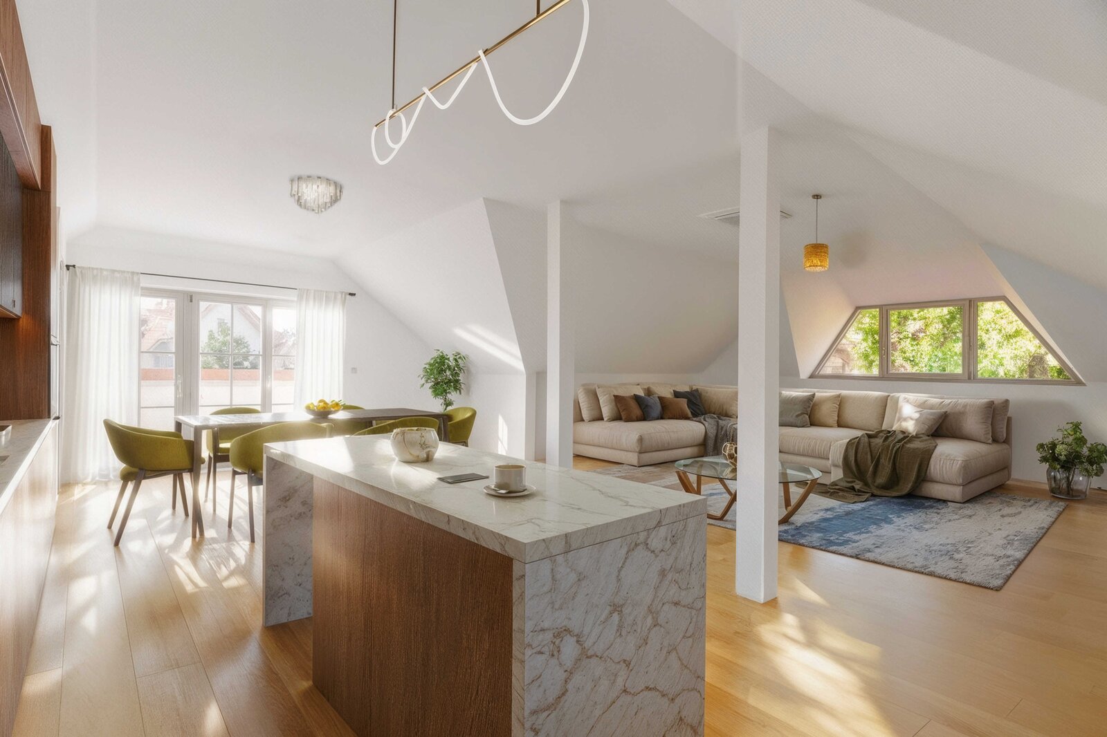 Třetí jednotka, podkrovní 4+kk, má 140,6 m² interiéru a venkovní prostor tvoří terasa o velikosti 24,32 m² a balkon 8,63 m². Podkroví vyniká vysokou světlostí, moderní architekturou a chytrým dispozičním řešením, kde je ložnicová část elegantně oddělena od denní zóny. Samostatný vstup přes terasu a venkovní schodiště dodává bytu originalitu i mimořádné soukromí.