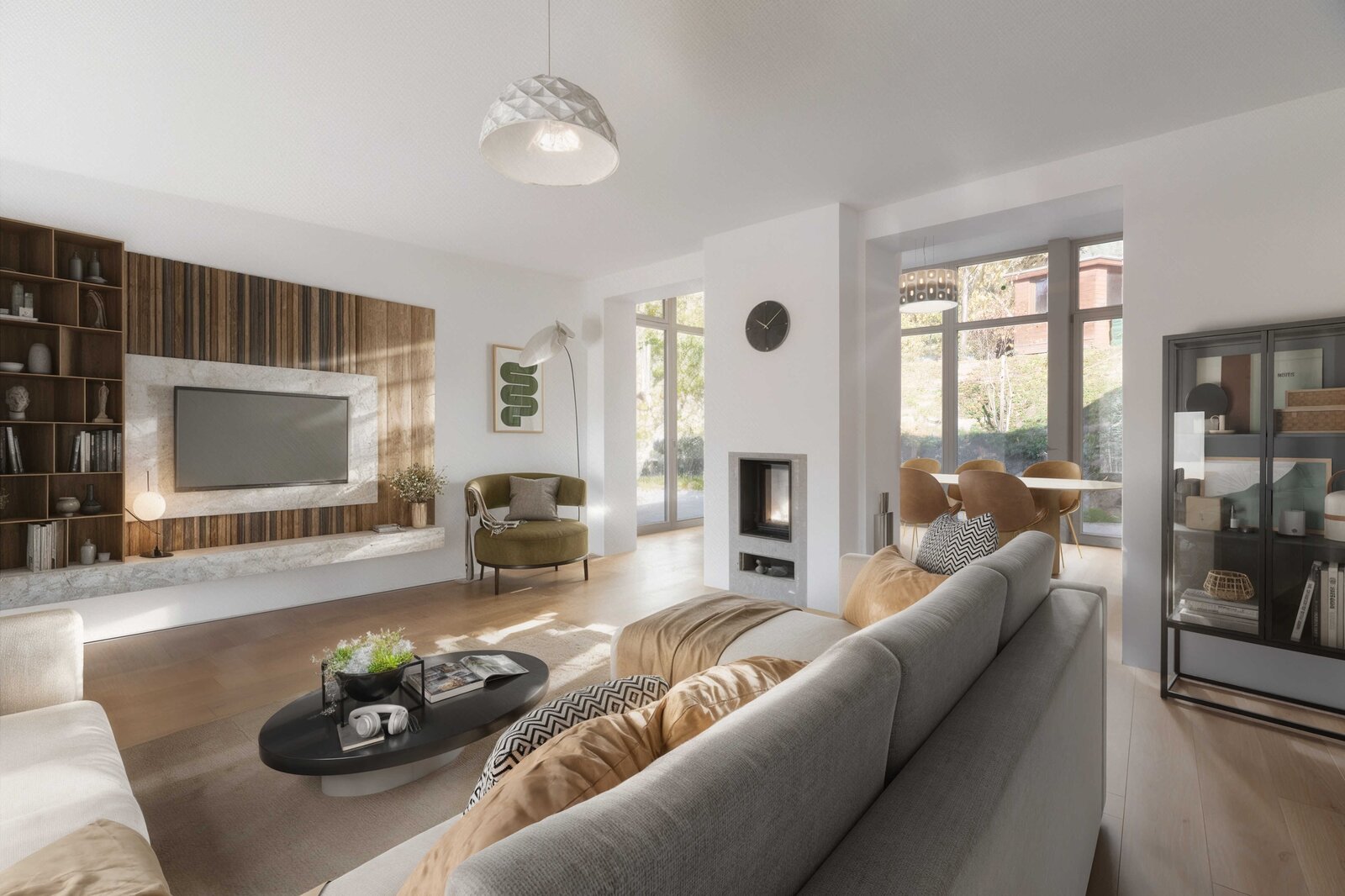 Druhá jednotka, celopodlažní 5+1, se rozkládá na 191,6 m² interiéru a disponuje rozsáhlou zahradou o velikosti 388 m² a dvěma balkony. Dominantou je velkorysý obývací pokoj s krbem a prosklenou stěnou, který volně navazuje na jídelnu, kuchyni a venkovní obytnou terasu. Čtyři samostatné pokoje, dvě koupelny, šatna a technické zázemí vytvářejí dispozici ideální pro velkou rodinu či klienty požadující nadstandardní prostor. Celek je harmonicky propojen se zahradou, která tvoří skutečné zelené zázemí bytu.