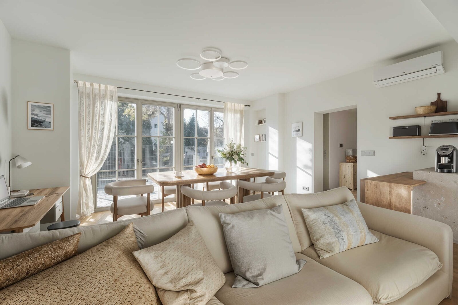 První ze tří jednotek, přízemní 4+kk, který nabízí 128,72 m² interiéru a 109,02 m² zahrady s terasou. Atmosféra přízemního bytu je umocněna velkými francouzskými okny směřujícími do zeleně a přímým vstupem ven ze všech obytných místností. Dispozice zahrnuje dvě koupelny, šatnu a komoru a celý prostor je navržen tak, aby poskytoval harmonii mezi soukromím, komfortem a elegancí.