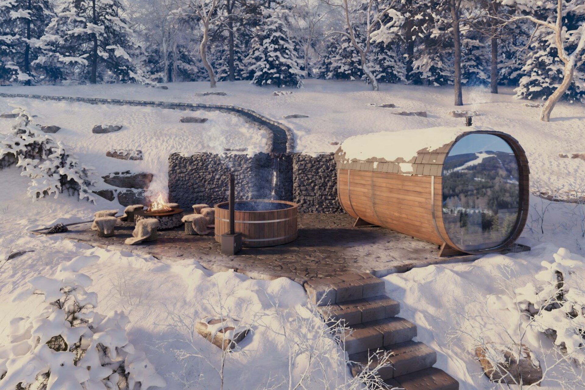 Na Základně máte k dispozici také soukromé venkovní wellness, které nabízí skvělé podmínky pro odpočinek, regeneraci těla i mysli. Vychutnejte si saunu s výhledem na horskou krajinu, uvolněte se ve vířivce a užijte si příjemné večery s přáteli u venkovního ohniště. Atmosféru pro dokonalou relaxaci vám navodí šumění potůčku s vodopádem, který protéká kolem.